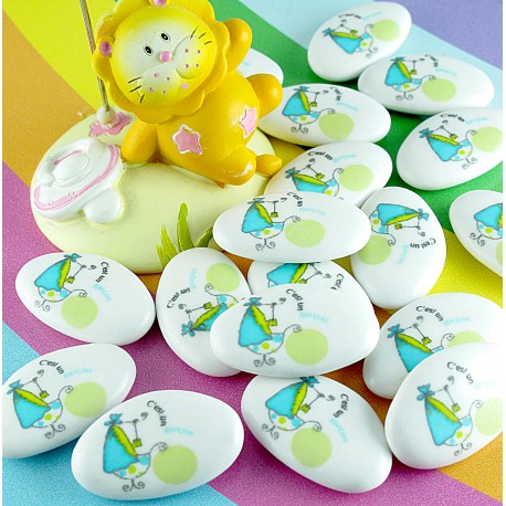 Impression couleur, sur dragées chocolat blanche, une seule face.